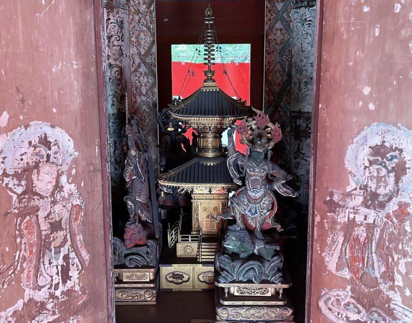 海住山寺は国宝五重塔を擁することで有名です。この五重塔は日本で2番目に低い五重塔で、鎌倉時代、慈心上人の頃に建てられたものと考えられています。高さ17.7メートルと小規模ながら、優美な姿と繊細な構造で広く称賛されています。心柱が2階から上にのみあって、1階部分には心柱が無いことが特徴です。また、1階部分には国宝の内陣扉絵と重要文化財の四天王像が収められています。