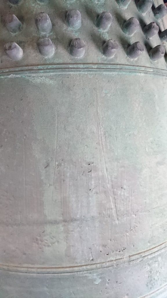 新薬師寺の梵鐘は、日本の歴史に文字通りその痕跡を刻んでいます。天平時代の初期に誕生したこの梵鐘は、まさに日本の鐘づくりの歴史の端緒と言えるものです。当時の梵鐘には、撞座(つきざ)と呼ばれる打鐘ターゲットの位置が高いという特徴がありました。また、頭頂部の突起である竜頭が横を向いており、これは後の時代とは90度異なる方向で作られています。平安時代以降、鐘の響きを良くするために撞座が低くなり、鐘の揺れに合わせて竜頭の方向が修正されていきました。この特徴を持つのは日本最古の妙心寺鍾、観世音寺鍾、興福寺鍾など国宝指定になっています。同じ特徴を持つ新薬師寺の梵鐘も来歴が明らかになれば国宝になり得る逸品と言えるでしょう。